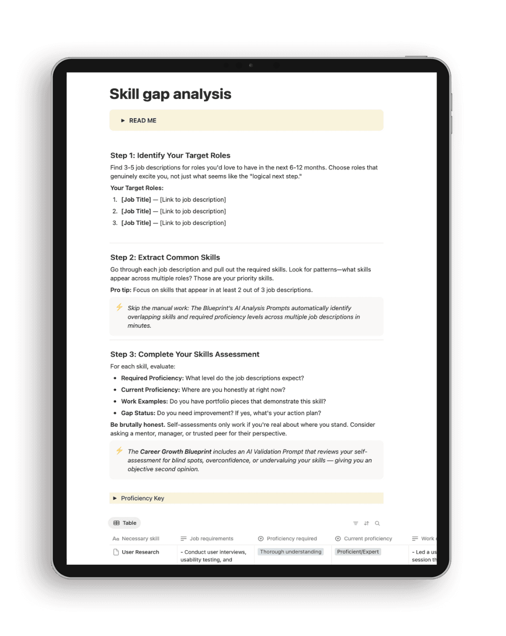 ✓ 1–5 Proficiency Scale Rubric — An objective framework to rate your current skills honestly—from "No Understanding" to "Mastery"—so you stop guessing your level